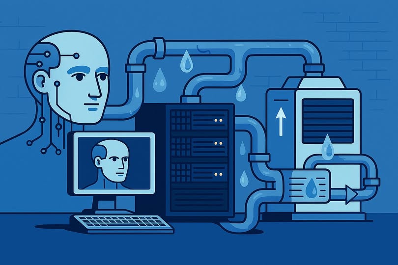 التصميم المرفق من عمل الذكاء الاصطناعي ويبين كيف تبرّد الحواسيب بالماء، ولا ندري كم من الماء قد استهلك لتوليد هذا التصميم!!