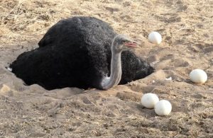 الأمر الآخر، تضع أنثى النعام بيضها في حفرة وترقد فوقها كما هو موضح في الصورة، وتقوم من حين لآخر بمد رأسها داخل الحفرة لتفقد البيض وتقليبه وبذلك تبدو وكأنها تدفن رأسها في الرمال..