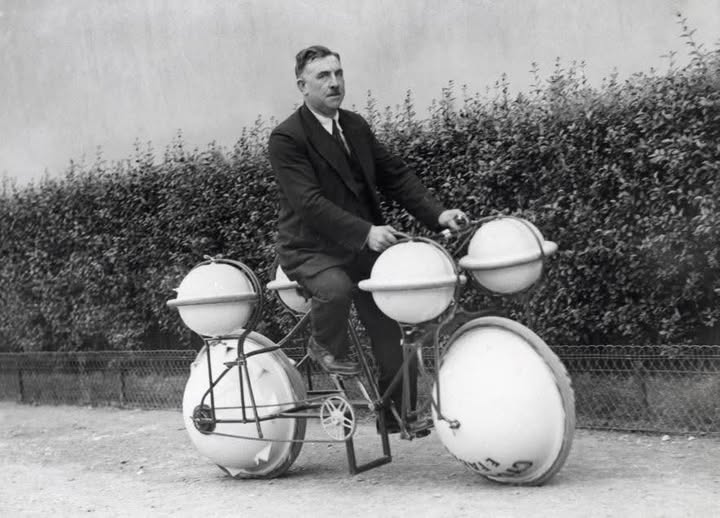 أول دراجة هوائية برمائية في التاريخ هي الظاهرة في الصورة المرفقة أعلاه وأطلق عليها اسم “سايكلومر”. كُشف عنها النقاب في باريس بفرنسا عام 1932 وكانت عبارة عن دراجة هوائية مثبت على عجلاتها وبدنها طوافات هوائية من المفترض أن تساعدها على الطوفان فوق سطح الماء.